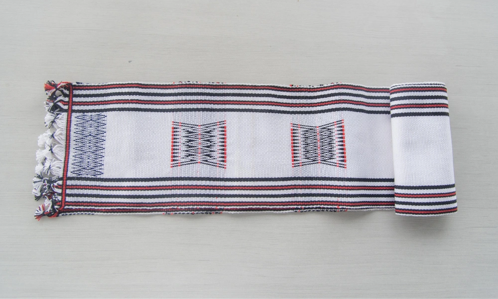 The Angami community is renowned for their textile weaving, which reflects their cultural heritage, identity, social structures, and spiritual beliefs. Their textiles feature a dominant colour palette of white, black, and red, with intricate embroidery and symbolic motifs  weaved by the skilled women. Among the most recognized garments is the Thotsepfhe, a white cotton shawl with black embroidered designs.